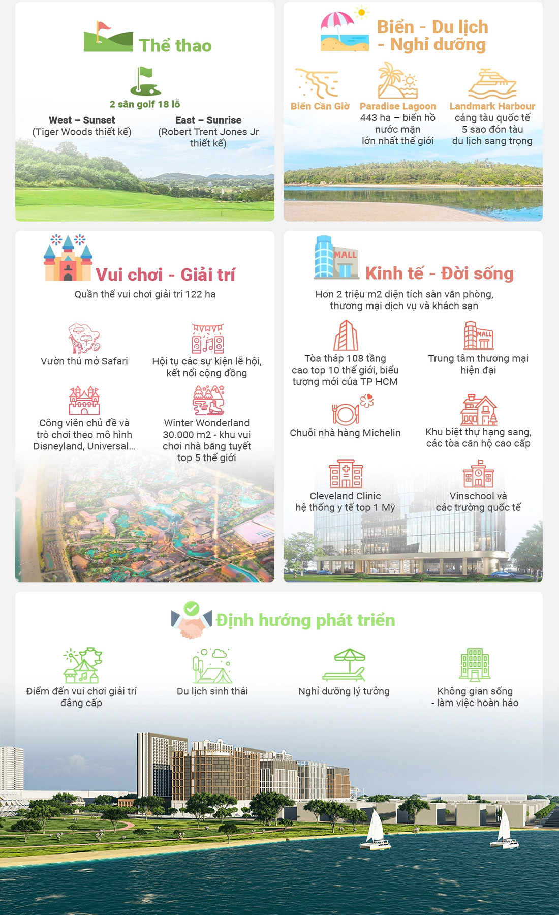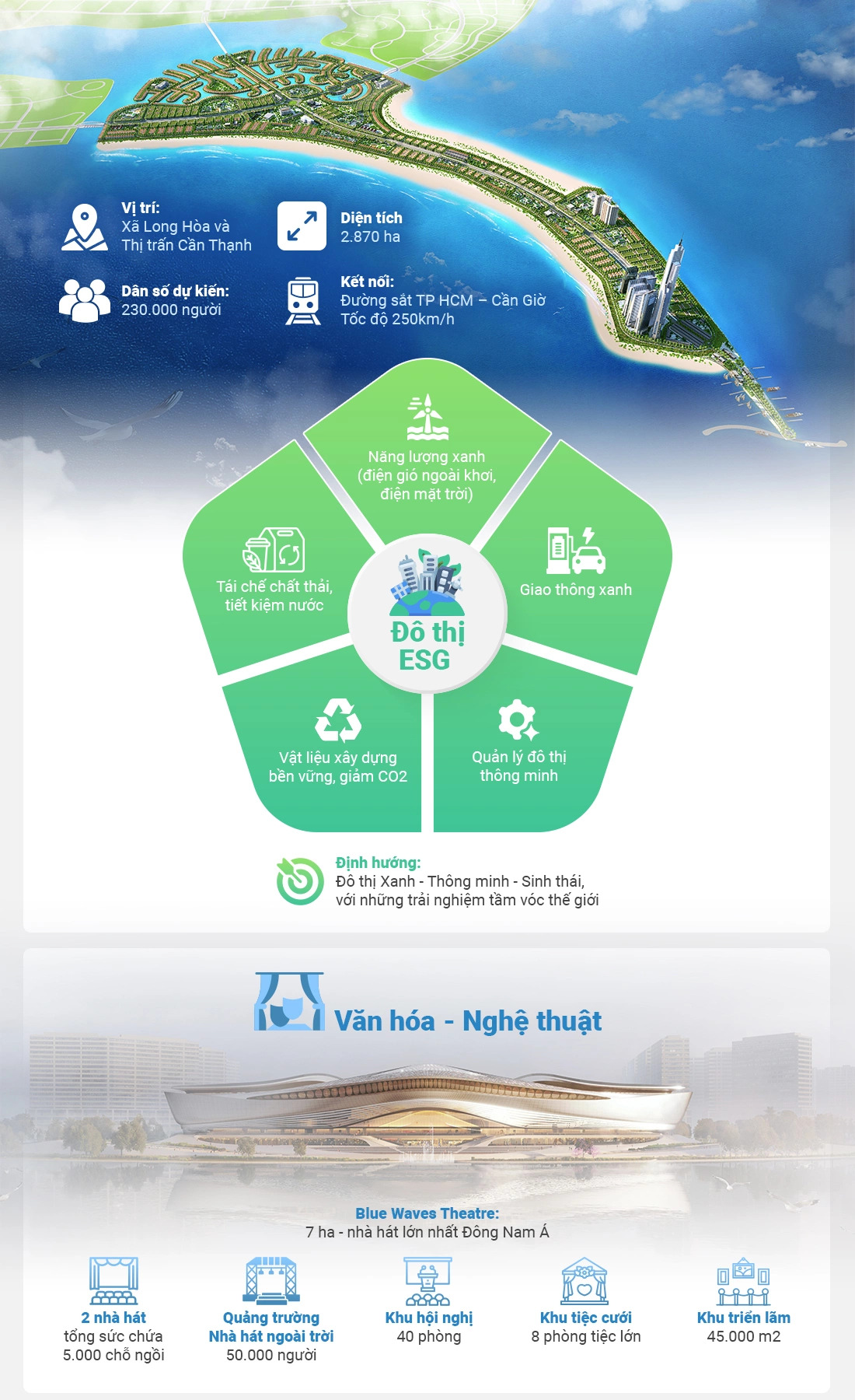 Với vị trí hiếm có ba mặt giáp biển Đông, một mặt giáp rừng ngập mặn nguyên sinh, tạo nên không gian sống hài hòa giữa thiên nhiên và hiện đại. Vinhome Cần Giờ cung cấp đa dạng loại hình sản phẩm như biệt thự, nhà phố, shophouse và căn hộ cao tầng, cùng hệ thống tiện ích đẳng cấp như Paradise Lagoon, Nhà hát Sóng Xanh và các khu vui chơi giải trí, nghỉ dưỡng cao cấp. Dự án được kỳ vọng sẽ trở thành biểu tượng mới của TP.HCM, thúc đẩy phát triển kinh tế biển và du lịch nghỉ dưỡng tại Cần Giờ.